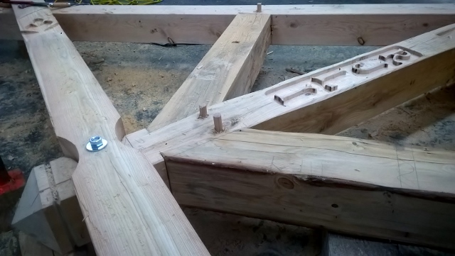 Taille de poutres à la hache: Nous équarrissons vos arbres courbes ou non. Il est, par la suite, possible de les intégrer, grâce au ''piquage'', à nos structures, sur des constructions neuves, rénovations ou réfection de patrimoine.